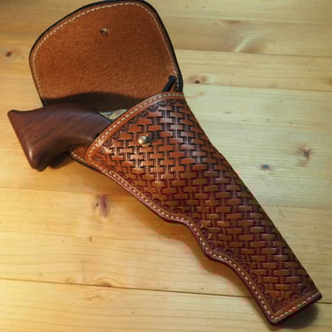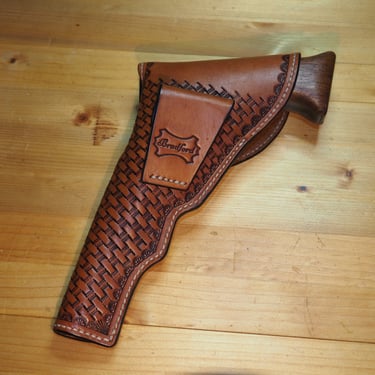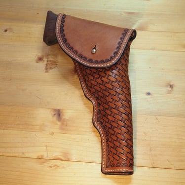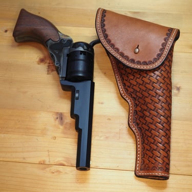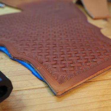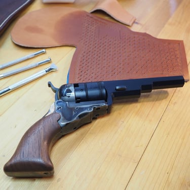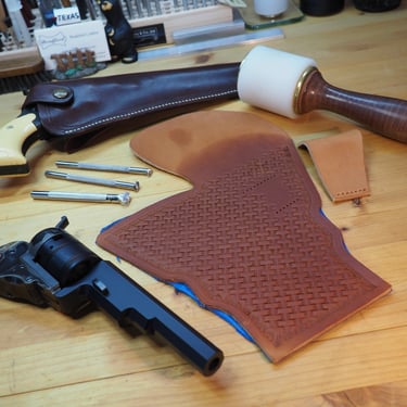 The Colt Paterson was in use in the U.S., England and France and it derived its name from being produced in Paterson, New Jersey. 1836–1865 It had no trigger guard as most modern weapons do. The trigger drops when the hammer is pulled back. I am working on a Colt holster for a customer. This one is the same revolver or wheel gun type, but it has a short barrel. The customer also wanted a full flap over the gun. This is posing quite a challenge because I am having to design as I go. At this point, I am wondering if I should continue the tooling to include the flap or just do a simple boarder stamp around the perimeter. Or just leave it plain. What do you think I should do with the flap portion? I certainly hope the customer likes it! よろしくお願いします!