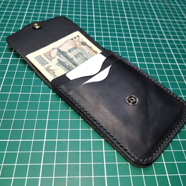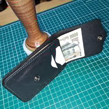 Trying out a money clip wallet without the clip. The wallet has a slot in the back for currency. It has two card pockets and can hold 2 to 6 cards. よろしくおねがしいします! Thank you!